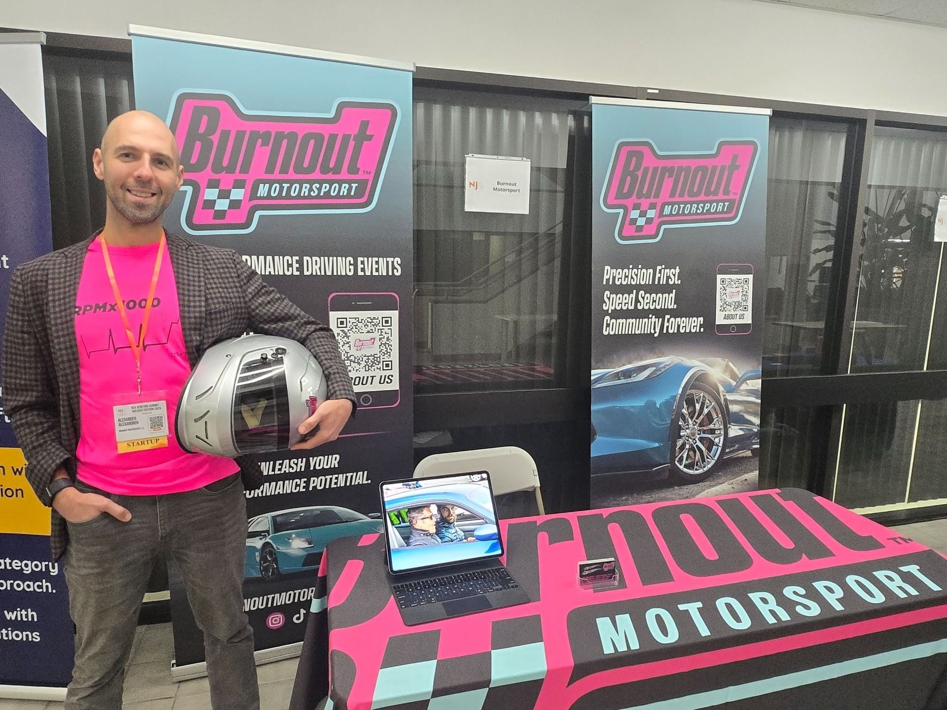 A two-hour drive down to Montgomery from Westchester County, NY, didn’t stop Alex Alexandrov, chief enabling officer for Burnout Motorsport, from attending the December 3rd event at 23 Orchard Road and showing up in style. He presented an innovative booth with neon pink and baby blue, complete with a car racing backdrop and motorcycle helmet.